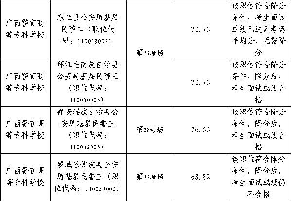 根據(jù)廣西壯族自治區(qū)2013年度政法干警招錄培養(yǎng)體制改革試點(diǎn)招考公告中“報(bào)考計(jì)劃錄取人數(shù)與實(shí)際面試人數(shù)比例為1:1職位的人員,其面試成績(jī)要達(dá)到當(dāng)天所在考官組面試的所有人員的平均分以上(含平均分)且不得低于60分,方為合格。經(jīng)自治區(qū)公務(wù)員主管部門批準(zhǔn),報(bào)考少數(shù)民族艱苦邊遠(yuǎn)地區(qū)和緊缺職位的人員,其面試合格分?jǐn)?shù)線可在考場(chǎng)平均分的基礎(chǔ)上降低5分,但不得低于60分。”的規(guī)定,現(xiàn)將2013年公安系統(tǒng)招錄培養(yǎng)體制改革試點(diǎn)報(bào)考計(jì)劃錄用人數(shù)與面試人選的比例在1:1以下(含1:1)職位所在考場(chǎng)面試平均分公布如下: