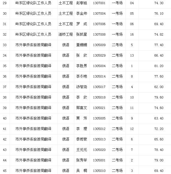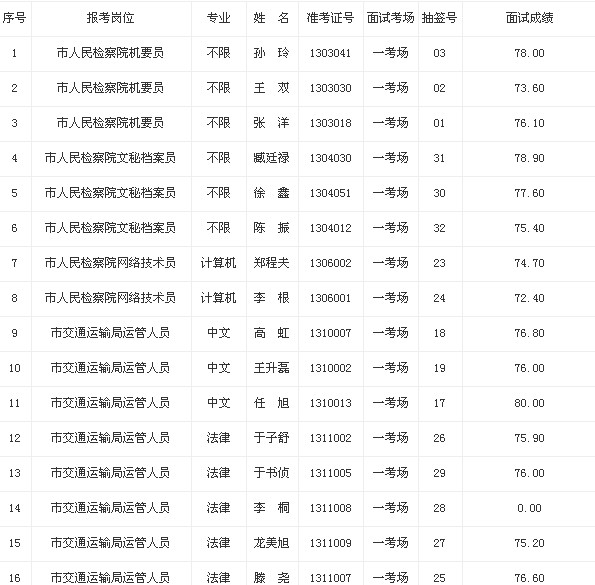 2013年黑龍江省雙鴨山市事業(yè)單位面試成績(jī)公布如下: