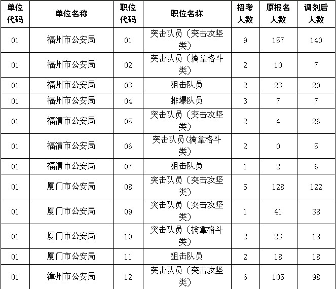 根據《福建省2013年度面向特殊技能人才考試錄用人民警察的公告》要求,現將各職位調劑后報名情況公布如下: