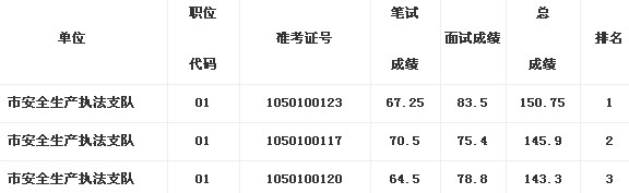 根據《漳州市2013年市級機關公開遴選公務員公告》,現將進入遴選面試的3位考生面試成績予以公示,如有疑問請聯系市安監局辦公室,電話:2030032;市公務員局職位管理與考錄科,電話2029201。