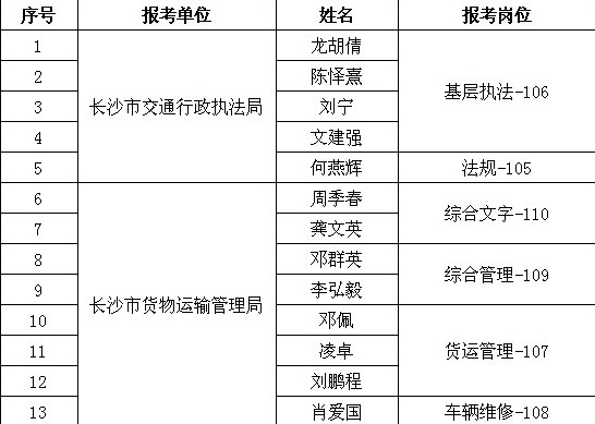 長沙市交通運輸局所屬事業單位2013年公開招聘工作人員,經報名、資格審查、筆試、面試、體檢、考察等程序,按照《招聘公告》相關規定擬錄取以下20人,現公示如下: