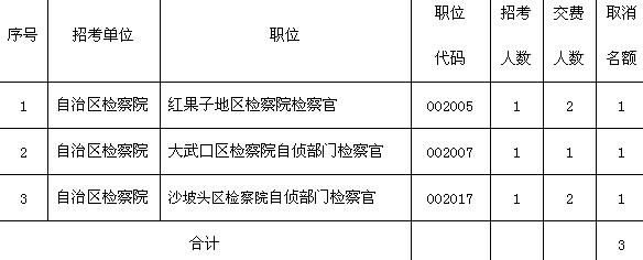 2013年下半年全區公務員招考網上報名結束后,全區法院、檢察院系統部分免筆試職位報名人數未達到面試最低開考比例。根據2013年下半年寧夏回族自治區招考公務員(參照公務員法管理單位工作人員)公告規定,經研究,減少或取消部分招考職位的招考名額。現將有關事項公告如下: