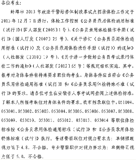 摘要 2013年安徽省蚌埠市政法干警體檢時間為12月7日。