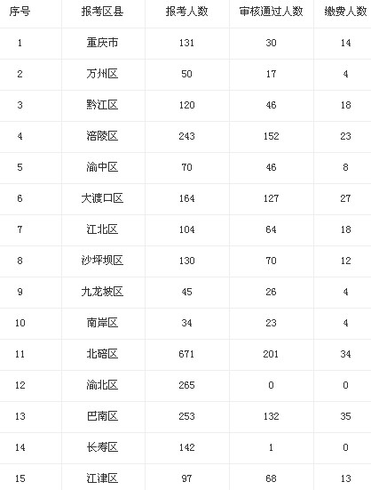 統(tǒng)計(jì)截止到2013年12月6日17:00,2014年重慶選調(diào)生考試共計(jì)報(bào)名4988人,審核通過2128人,繳費(fèi)424人。