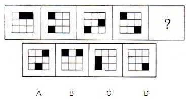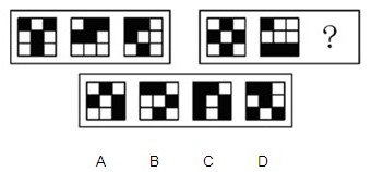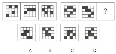 對于黑方塊而言,除了可以像上面的例題一樣進行位置上的變化,也考查方塊本身的“黑”與“白”,如例3。這就涉及到了圖形推理中樣式題目中的圖形相加運算問題,這類題目只要考生能夠考慮到基本上題目就可以得出答案,所以考生在做題過程中應先按照位置題目去考慮,如果無法得出規律,不妨考慮一下相加問題,轉變思維,提高效率。