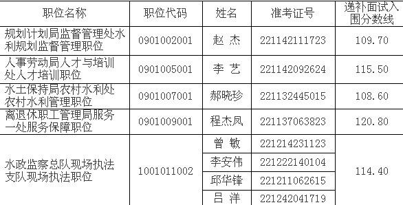 因部分考生自愿放棄面試資格,根據公務員招考有關規定,擬按照公共科目筆試成績從高到低的順序遞補5個職位的8名考生進入面試名單(名單附后),請遞補考生按照《水利部長江水利委員會2014年度考試錄用公務員面試公告》的有關要求,于2月11日下午17:00前進行面試確認,于2月12日前(以郵戳為準)郵寄相關復審材料。