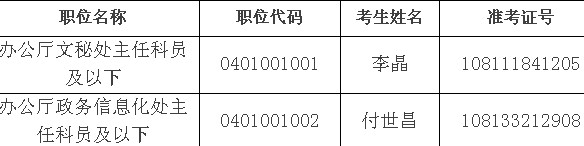 根據公務員招考有關規定和資格復審結果,擬在公共科目筆試合格的考生中,按照筆試成績從高到低的順序,遞補以下2位考生為面試人選: