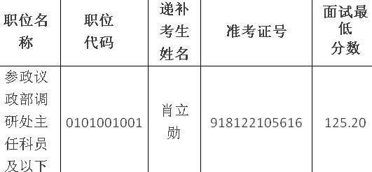 因部分考生自愿放棄面試資格,根據(jù)公務員招考有關規(guī)定,擬在公共科目筆試合格的考生中,按照筆試成績從高到低的順序遞補面試人選。具體情況如下: