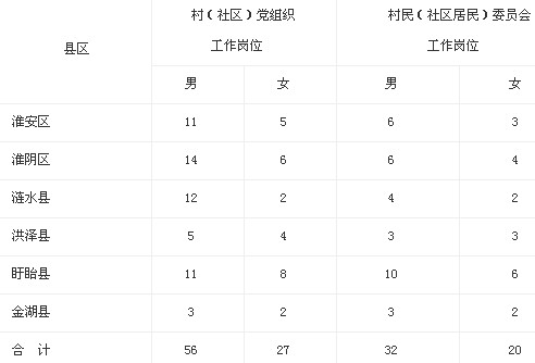 全市選聘到村(社區)任職高校畢業生135名,其中淮安區25人、淮陰區30人、漣水縣20人、洪澤縣15人、盱眙縣35人、金湖縣10人,具體崗位要求如下: