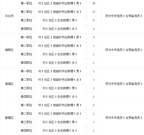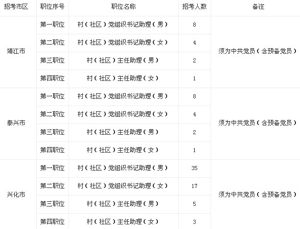 2014年,泰州市計劃選聘109名高校畢業生到村(社區)任職(其中:男71名,女38名),中共黨員(含預備黨員)原則上比例不低于80%。具體職位如下:
