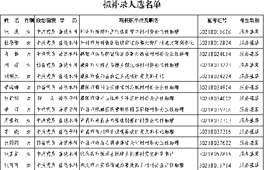 目前張漫等13名考生已按照有關文件規定,分別由當地組織部門組織進行了復檢,復檢結果全部合格。根據省委組織部、省人社廳等六部門《關于2013年選調優秀高校畢業生到基層工作的通知》(豫組通〔2013〕7號)有關規定,現將13名擬補錄人選名單予以公示,時間5天。公示期間,如有影響錄用問題的,不予辦理錄用手續。不予錄用及放棄錄用資格的,均不再進行人選遞補。請予監督。