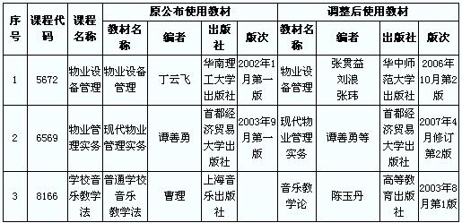 根據我省高等教育自學考試部分課程教材使用內容和供應等方面的實際情況,經有關主考學校組織老師審核和論證,決定調整我省高等教育自學考試《物業管理實務》等3門省統考課程使用教材(見附件),從2009年7月考試開始,上述課程按調整后的教材進行命題。