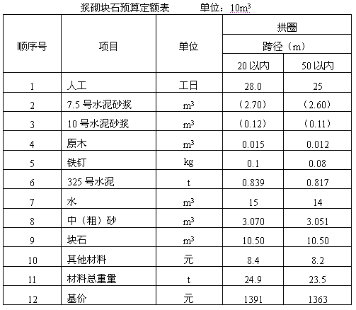 2.某漿砌塊石拱圈工程,跨徑18米,設計采用10號水泥砂漿砌筑,根據給定的漿砌塊石預算定額表,試確定水泥、砂和塊石的預算定額。