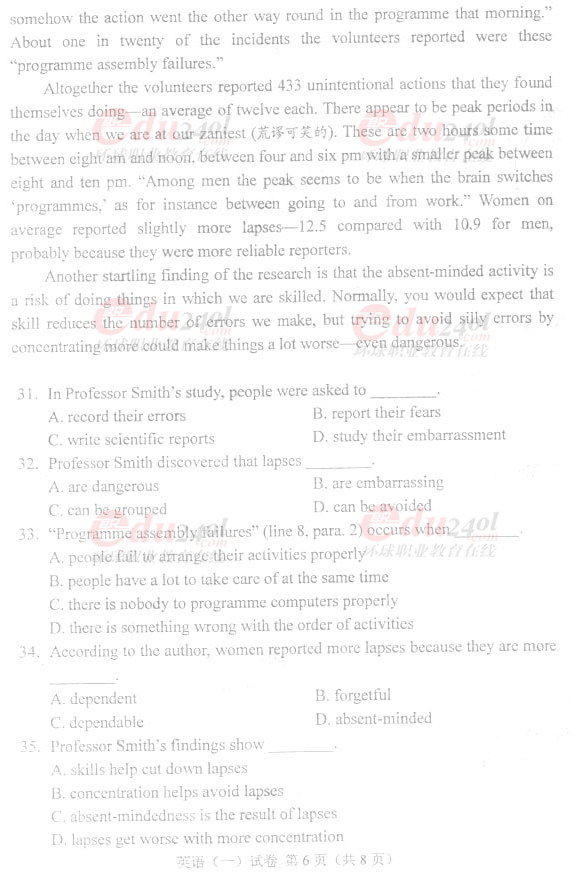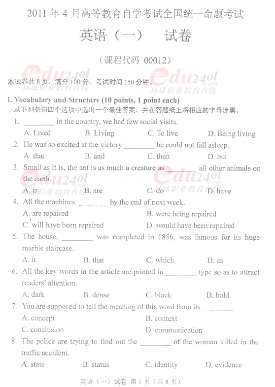 全國(guó)2011年4月自學(xué)考試英語(yǔ)(一)試題
