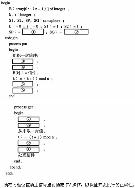 53.當(dāng)用PV操作來(lái)管理一個(gè)可容納n封信件的公用信箱來(lái)實(shí)現(xiàn)進(jìn)程通信時(shí),發(fā)送進(jìn)程和接收進(jìn)程并發(fā)執(zhí)行的程序結(jié)構(gòu)如下: