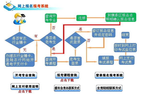 考生登錄內(nèi)蒙古招生考試信息網(wǎng)-自學(xué)考試頻道,進(jìn)入網(wǎng)上報(bào)名報(bào)考系統(tǒng)。考生注冊(cè)、查詢開考專業(yè)、填報(bào)考試課程,以及交納報(bào)考費(fèi)等內(nèi)容全部在網(wǎng)上進(jìn)行;新生注冊(cè)后需要到旗縣區(qū)報(bào)名點(diǎn)現(xiàn)場(chǎng)掃描二代身份證、照相、確認(rèn)報(bào)名信息。