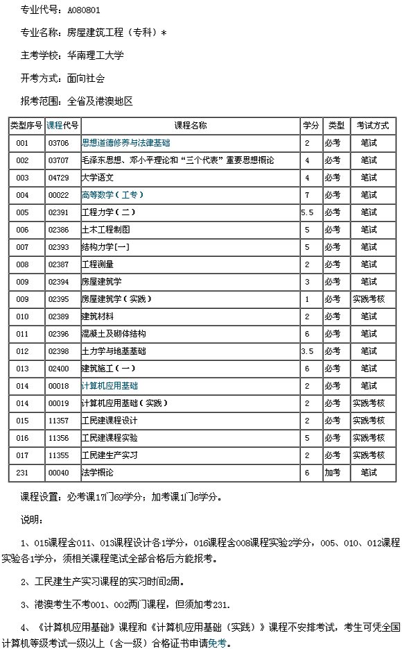 摘要 廣東2013年華南理工大學自考房屋建筑工程(專科)考試計劃