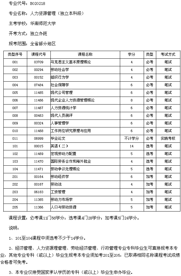 廣東2013年華南師范大學人力資源管理(本科)考試計劃