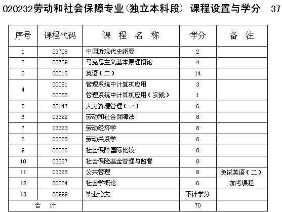重慶市自考勞動和社會保障專業(獨立本科段)課程設置與學分