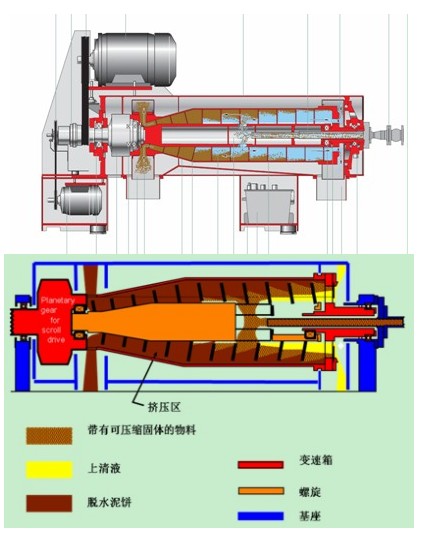臥螺離心機是臥式螺旋卸科離心機的簡稱,主要由高轉速的轉鼓,與轉鼓轉向相同轉速略低的螺旋和差速器等部件組成。當污泥進入離心機轉鼓腔后,高速旋轉的轉鼓產生強大的離心力,污泥被甩貼在轉鼓內壁上,形成固環(huán)層;而水的密度較小,離心力也小,只能在固環(huán)層內側形成液環(huán)層。由于螺旋和轉鼓的轉速不同,二者存在相對運動(即差轉速),把沉積在轉鼓內壁的污泥推向轉鼓小端出口處排出,分離出的水從轉鼓的另一端排出。差速器的作用是使轉鼓和螺旋之問形成一定的差轉速。污泥先經過過濾罐過濾,然后進一步由切割機把行泥粉碎,進入螺桿泵.由螺桿泵輸送離心機。