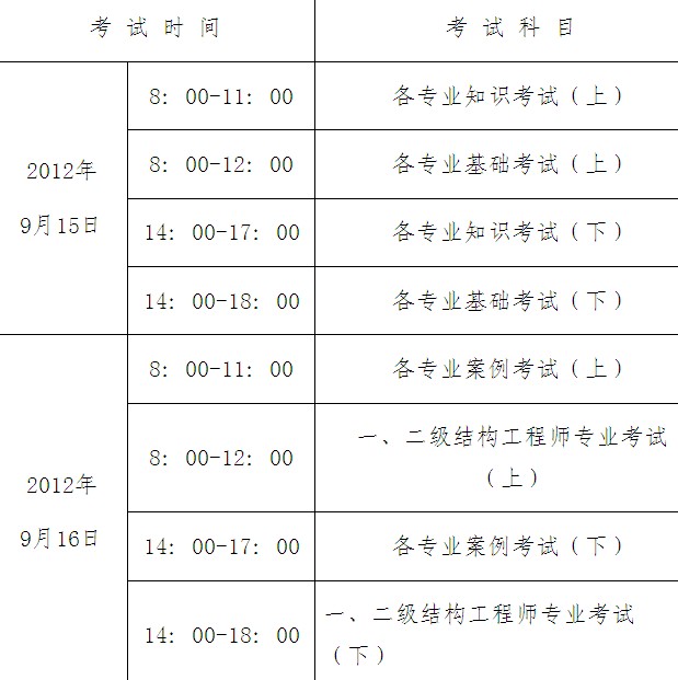 2012年度全國勘察設計注冊工程師執業資格考試考務工作時間安排表