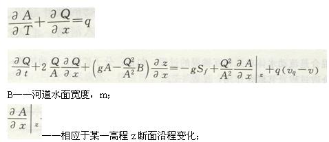 河道非恒定流常用一維圣維南方程描述。河道有側(cè)向人流時,基本方程為: