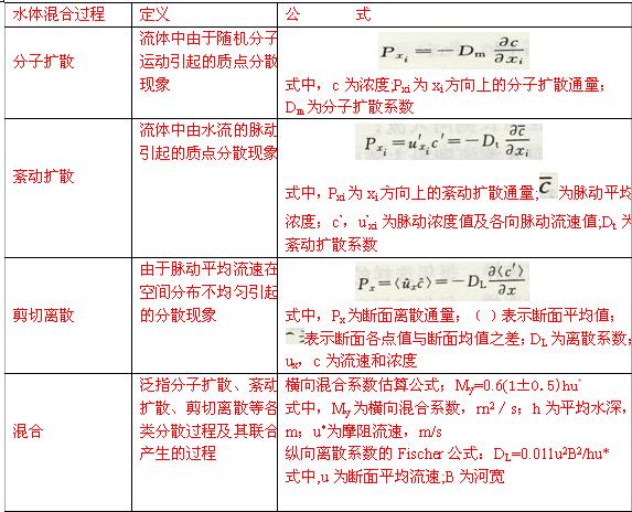 混合是流動水體單元相互摻混的過程,包括:分子擴散;紊動擴散;剪切離散等分散過程及其聯合作用,見表47。