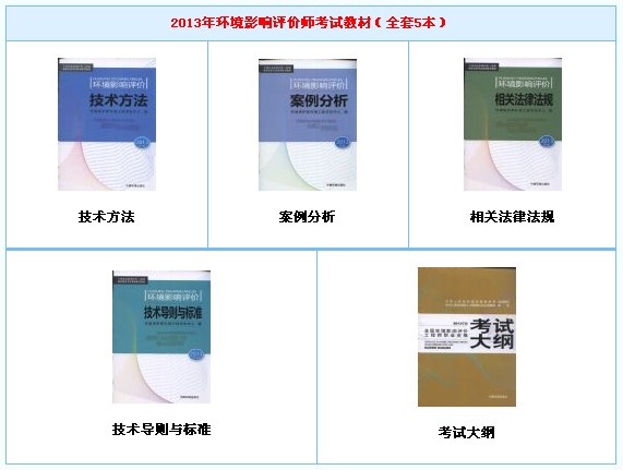 2013年環境影響評價師考試教材,包含以下5本:2013年全國環境影響評價工程師職業資格考試大綱、2013年全國環境影響評價工程師職業資格考試系列參考教材-環境影響評價技術方法、環境影響評價案例分析、環境影響評價相關法律法規、環境影響評價技術導則與標準。