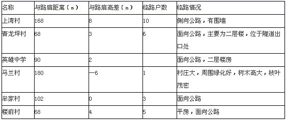 案例、高速公路(2006年考題):某段高速公路2005年建成通車,建設(shè)單位申請竣工環(huán)境保護(hù)驗(yàn)收。該項(xiàng)目在可行性研究階段完成環(huán)境影響評價(jià)的報(bào)批手續(xù),在初步設(shè)計(jì)和實(shí)際建設(shè)中對線路走向和具體的建設(shè)工程內(nèi)容有少量調(diào)整。該段高速公路全長50公里,設(shè)計(jì)時(shí)速80公里/小時(shí),設(shè)1104米特大橋一座,中小橋若干座,特大橋橋面設(shè)排水孔;雙洞單向隧道2座,單洞長3200米,互通式立交1處,分離式立交1處,服務(wù)區(qū)1處,取土場8處,棄渣場20處,共征用土地206公頃,公路所經(jīng)地區(qū)為山嶺重丘區(qū),其中通過水土流失重點(diǎn)治理區(qū)的線路長度5公里,特大橋從A城市的集中式飲用水源二級保護(hù)區(qū)邊界跨越。由于線路偏移,聲環(huán)境敏感點(diǎn)由原來的12處變?yōu)?處,其中4處與環(huán)評審批時(shí)一致,8個(gè)取土場有2個(gè)分布在水土流失重點(diǎn)監(jiān)督區(qū),有1個(gè)在重點(diǎn)治理區(qū),棄渣場均分布在沿線的溝壑,服務(wù)區(qū)靠近一人口約2000人的村莊,設(shè)有1.5噸/小時(shí)燃煤鍋爐一座,煙囪高度20米,服務(wù)區(qū)廢水經(jīng)化糞池處理后排放到服務(wù)區(qū)外沖溝,經(jīng)過100米匯入經(jīng)該村的小河上游,公路沿線部分敏感點(diǎn)情況見下表: