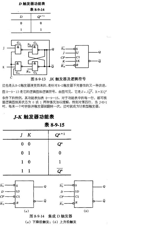 上述觸發器,在時鐘脈沖為高電平期間,若輸入信號變化,輸出狀態隨之變化。當它作為計數用時,就會出現空翻現象,沒有實用價值,但作為理解觸發器的功能來說它是很直觀的。在實用的集成觸發器中采用維持阻塞結構和主從結構的邊沿觸發器來解決空翻現,象。對其內部結構這里不作介紹。它的功能和邏輯符號與前述觸發器一致,但應該明確,觸發器根據輸入控制信號的狀態翻轉是發生在時鐘脈沖的上升沿或下降沿,其符號以集成D觸發為例示于圖8―9―14,其他集成觸發器可類推。