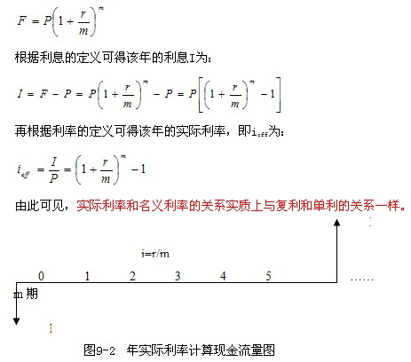 已知某年初有資金P,名義利率為r,一年內(nèi)計息m次(如圖9-2所示),則計息周期利率為i=r/m。根據(jù)一次支付終值公式(參見公式14-1)可得該年的本利和F,即: