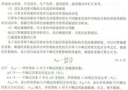 敏感性分析的目的是考察投資方案主要因素發生變化時,其方案凈效益發生的相應變 化,以判斷這些因素對項目經濟目標的影響程度。這些可能發生變化的因素稱為敏感因 素。若某因素值的較小變化能導致經濟效益的較大變化則稱投資經濟效益對該因素的敏感 性大;反之,則稱敏感性小。敏感性分析就是要找出項目的敏感因素,確定其敏感程度, 以預測方案承擔的風險。敏感性分析不僅可以使決策者了解敏感因素對評價指標的影響, 還可以著重分析那些較為敏感的因素,以提高決策的準確性。
