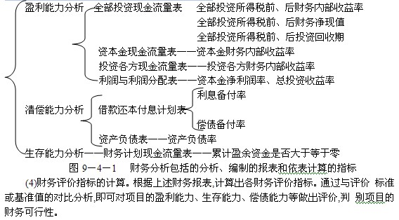 項目的生存能力、盈利能力、清償能力等財務狀況,取決于項目的財務效益和費用的 大小及其在時間上的分布,是通過財務報表以及計算相應的評價指標來進行判斷的。因 此,為判別項目的財務可行性所進行的財務評價應該包括以下內容: