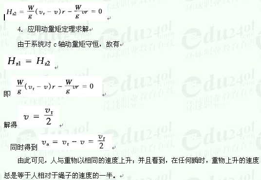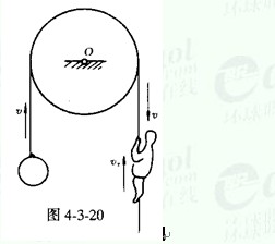 令人沿著繩子向上,因此,必然要引起重物上升,才能保持系統(tǒng)對O軸動量矩為零。設(shè)某一瞬時,人相對于繩子的速度為vr,而重物上升的速度為v。注意到重物上升的速度就是繩子中下運動的速度。因此,人的絕對速度va=vr-v0。設(shè)滑輪的半徑為r,則此時系統(tǒng)的動量矩為