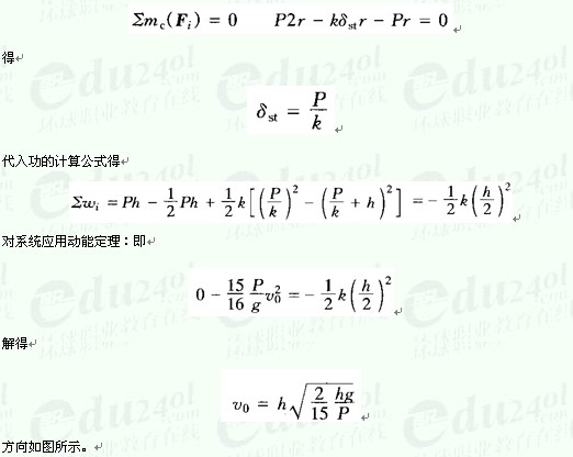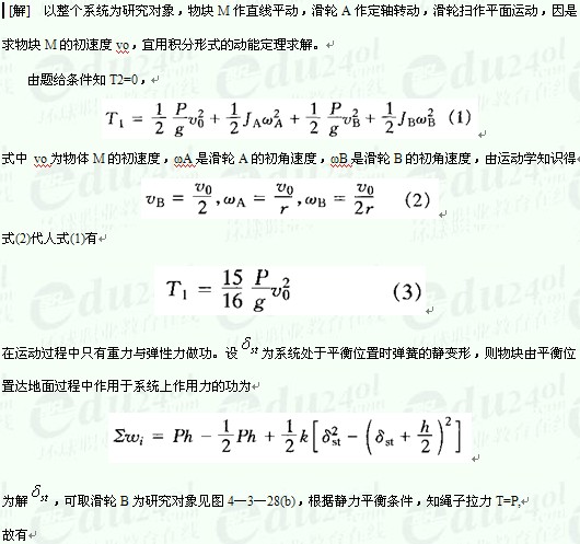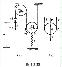 [例4-3-10] 系統如圖4—3—28所示。已知:物塊M和滑輪A、B的重量均為P,且兩滑輪視為均質圓盤,彈簧的剛性系數為k,繩重不計,繩與輪間無相對滑動。當M離開地面h時,系統處于平衡。現給M以向下的初速度vo,欲使其恰能到達地面。試問vo應為多少?