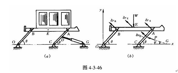 (3)分析各構(gòu)件的運(yùn)動(dòng),并作出系統(tǒng)的虛位移圖。因?yàn)樯蹬_(tái)BA作平動(dòng),所以B、E、A點(diǎn)的虛位移相等,即δrB=δrE=δrA。設(shè)D點(diǎn)的虛位移為δrD,其大小δrD=0.5δrA。各點(diǎn)虛位移如圖4—3—46(b)所示。