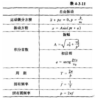一懸掛質量彈簧系統(tǒng),現(xiàn)取系統(tǒng)靜平衡位置為坐標原點O,建立坐標軸x,則以x為獨立參數(shù)的振體自由振動的運動微分方程、振動方程、特性參數(shù)等列于表4-3-11中。