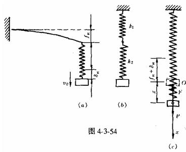 于是,圖4—3—54(a)所示振動系統可以抽象為圖4—3—54(b)所示的串聯彈簧系統。又因串聯彈簧可用一等效彈簧來替代,其當量剛性系數為