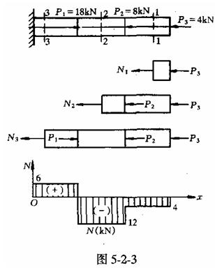 [例5-2-1] 畫出圖5-2-3中直桿的軸力圖。