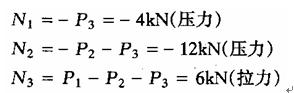 [解] 用截面1—1、2-2、3-3將桿截開,取脫離體如圖所示。各截面的軸力N1、N2、N3均假定為拉力。由靜力平衡方程∑X=0分別求得: