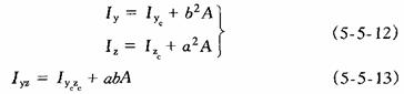 設任意形狀截面圖形的面積為A(圖5—5—4),形心為c,圖形對形心軸yc、zc的軸慣性矩分別為 ,慣性積為 ,則圖形對平行于形心軸的坐標軸y、z的慣性矩和慣性積分別為