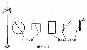 [例5—11-l ] 兩端為球鉸支承的等直壓桿,其橫截面分別為圖5—11-2所示。試問(wèn)壓桿失穩(wěn)時(shí),桿件將繞橫截面上哪一根軸轉(zhuǎn)動(dòng)。