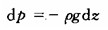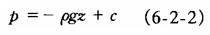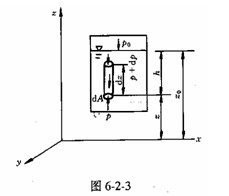 在容器中,取一圓柱體,它的水平截面積為dA(圖6-2-3),在重力作用下,水平方向因表面力大小相等,方向相反。在豎直方向,作用在底面的壓力等于p,方向向上;頂面的壓力等于p+dp,方向向下;質量力是重力pgdzdA方向向下,各力處于平衡狀態,有pdA—(p+dp)dA—pgdAdz=0,用dA遍除各項可得