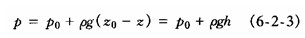 將自由液面z=z0,p=p0代入,求得積分常數c=p0+ρgz0代入上式,并用液面下的深度z0-z=h代入可得