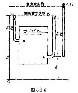 設一封閉容器如圖6-2-6所示,液面壓強p0。若在容器壁上任意取A、B兩點,并接上開口的玻璃管(稱測壓管),則測壓管內的液面離基準面的高度都由位置高度z和壓強高度p/ρg兩部分組成。在工程中常用“水頭”代表高度,所以z稱位置水頭,p/ρg稱壓強水頭,z+p/ρg 稱測壓管水頭,從圖中可以看出