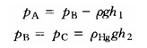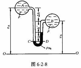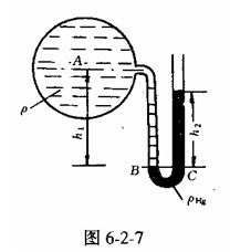 由于在工程上往往遇到的壓強(qiáng)較大,如果采用測(cè)壓管測(cè)壓,其管長(zhǎng)必然很長(zhǎng),不宜安裝且讀數(shù)不方便。此時(shí),可用U形測(cè)壓計(jì)。如圖6-2-7所示,因B,C是等壓面上的兩點(diǎn),可得