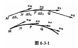 在流場(chǎng)中,從某一點(diǎn)M開(kāi)始,繪出在指定時(shí)刻該點(diǎn)的流速矢量uM如圖6—3—1所示。在uM上取△Sl得空間另一點(diǎn)N,繪出N點(diǎn)在同一時(shí)刻的流速矢量uN,然后在uN上取△S2得P點(diǎn),再繪出同一時(shí)刻P點(diǎn)的流速矢量uP,依此類推,可得在某一時(shí)刻t時(shí)折線MNPQ,若M,N,P,Q點(diǎn)無(wú)限接近,即△Sl、△S2、△S3……趨近于零時(shí),則MNPQ是一條光滑曲線,此曲線稱流線。顯然,位于曲線MNPQ上的所有質(zhì)點(diǎn)在該指定時(shí)刻均沿此曲線流動(dòng)。如果在整個(gè)流場(chǎng)中繪出同一時(shí)刻通過(guò)各空間點(diǎn)的一系列流線,則這些流線就形象地反映了該時(shí)刻的整個(gè)流動(dòng)圖景。