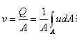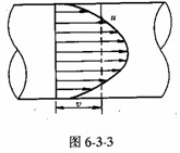 設元流過流斷面稱dA,流體質點的流速u(圖6-3-3)可得元流的流量dQ=udA。通過總流過流斷面A的流量應等于無數元流的流量總和。總流過流斷面上實際的流速分布是不均勻的。如圖6-3-3所示,實際流速分布各點的流速是不同的。在工程中常用斷面平均流速v代替(圖中虛線)。
