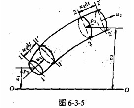 在流場中選取一元流,如圖6-3-5所示。在元流上取斷面1-1和斷面2-2,兩斷面的高程和面積分別為z1、z2和dA1、dA2。兩斷面的流速和壓強分別為u1、u2和p1、p2。以兩斷面間的元流段為研究對象,在dt時間內由原來的1122位置移動到1'1'2'2'位置,斷面1—1和斷面2-2分別移動了uldt和u2dt的距離。