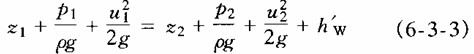 式(6-3-3)說明元流從一個斷面流到另一斷面的過程中,各項能量(位能,壓能,動能)在一定的條件下是可以互相轉化的。但是前一個斷面的單位機械能應等于后一個斷面的單位總機械能與兩斷面之間水頭損失之和。此方程是能量守恒在流體力學中的特殊表達形式。